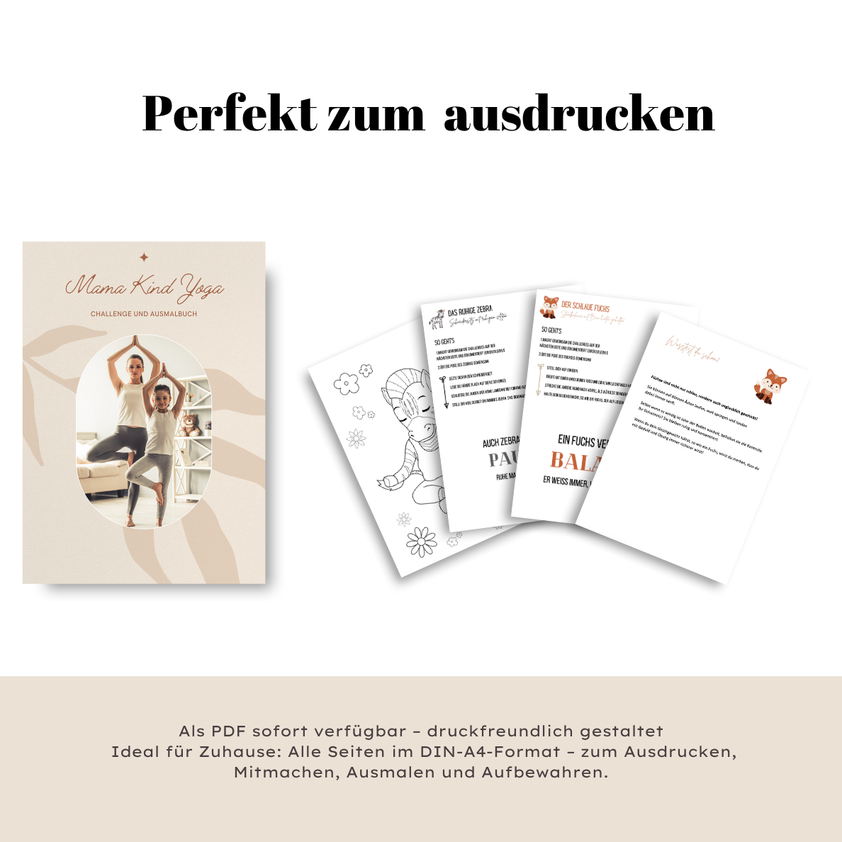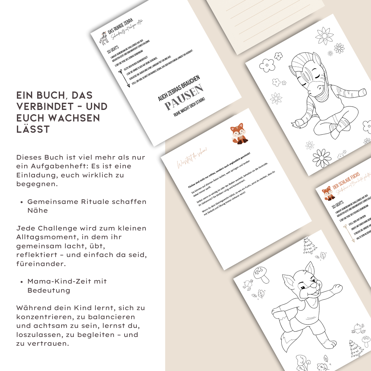 Es ist viel mehr als ein Malbuch: Jede Seite schafft einen echten Moment zwischen dir und deinem Kind. Die Kombination aus kindgerechter Yoga-Pose, kleiner Alltags-Challenge und liebevoller Ausmalseite bringt euch spielerisch in Bewegung – stärkt die Konzentration, die Körperwahrnehmung und vor allem eure Bindung.